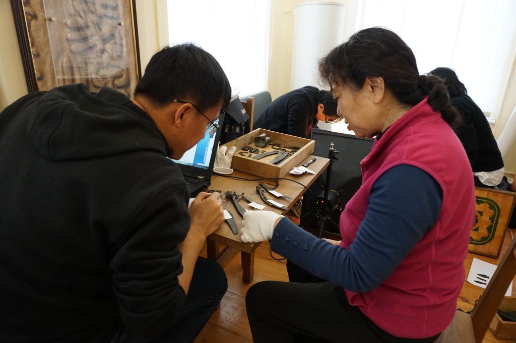 Professor Yang Jianhua and Professor Shao Huiqiu was organizing bronzes in the Minusinsk Museum