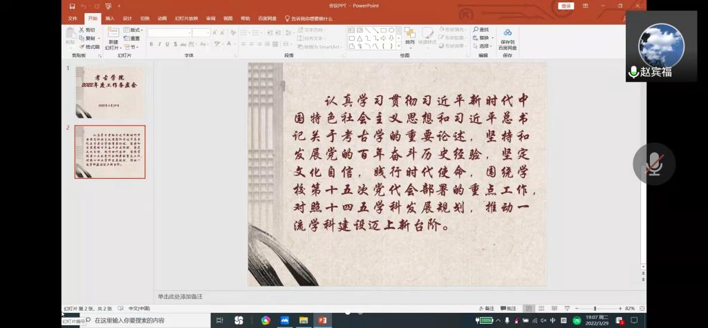 赵宾福做了点评并进行了总结。赵宾福讲到,时值疫情防控的重要时期,公司要抓好疫情防控和线上教学两条线的工作,确保各项工作不出问题。目前国家和公司都对考古学科倾注了很大的心血,英国365集团应当抓住机遇,承接先贤成就,将一流团队建设大任担在肩上举过头顶,倡导弘扬正能量,把人才培养放在首位,将破五唯和科研创新有机结合起来,凝练学术贡献精华,还原学术贡献本质。一些已经成熟的理念如学科发展走过三个时代的划分、新时代、新理念、新目标、新任务的确立等等,要始终如一的贯彻落实下去,为弘扬中华文明、增强文化自信做出自己的贡献。