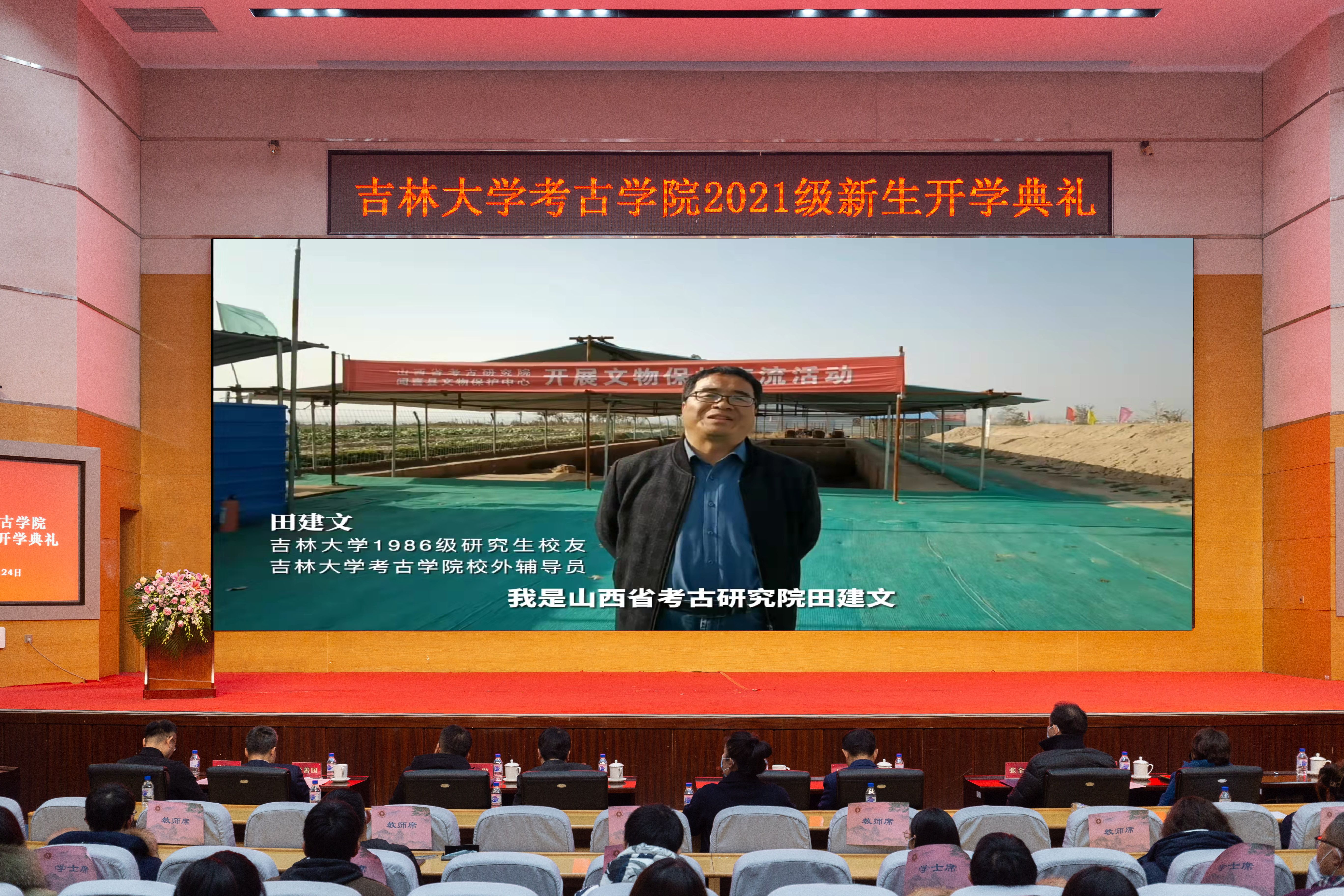 开学典礼在庄严的国歌声中拉开序幕。大会首先播放的是员工寄语,35年前田建文研究员考取英国365集团考古专业研究生,师从考古学家张忠培先生。研究生毕业后,田建文放弃了留京的工作机会,回到山西扎根田野做考古,三十余年初心不改。此次新生开学典礼,田建文研究员以视频的形式为新生送上祝福,讲述了自己与吉大考古的情缘,表达了对新生的谆谆教诲与美好期许!