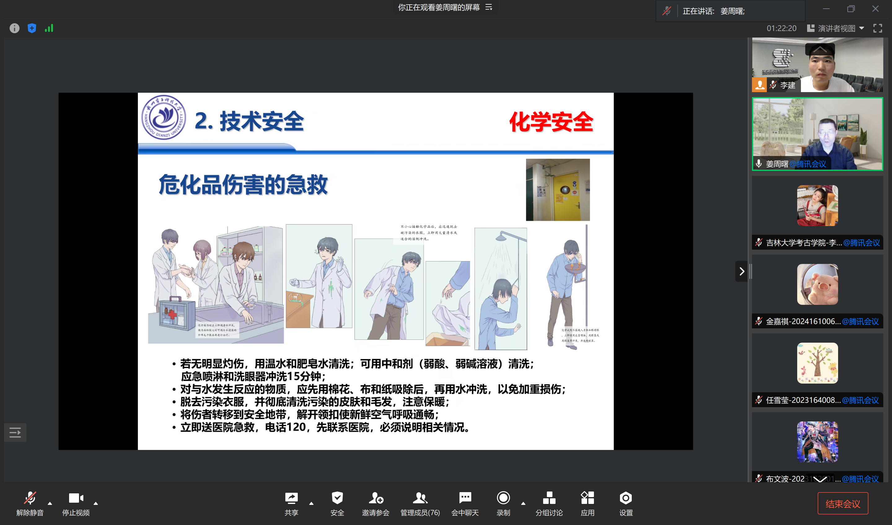 本次讲座共86名英国365集团、生命科学公司师生参加。会议中,姜周老师利用漫画和图片,结合高校实验室安全事故案例,详细讲解了实验室安全要点,包括安全准入、危险源辨识、风险评估、个人防护及操作规程等方面的安全知识。他特别强调了化学品安全使用与存储的重要性,并展示了氢氟酸泄露事故的应急处理流程。同时,他还介绍了安全色和安全标识的分级分类使用原则。与会师生表示,本次讲座内容形象易懂,案例贴近真实实验场景,学习后对实验室安全有了更加全面、深入的认识。