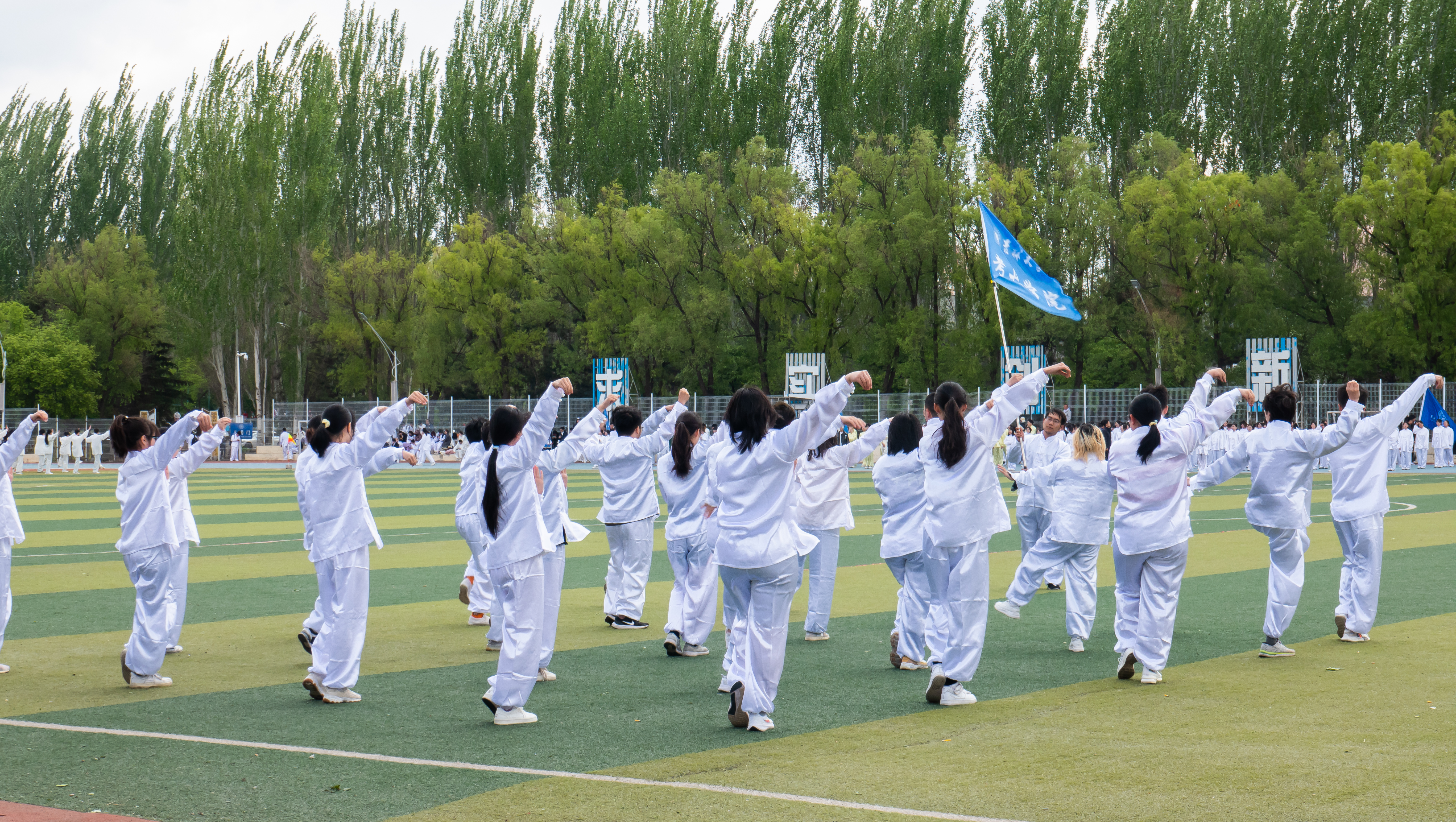 在等待入场的片刻,同学们再次熟悉了口令,确保动作整齐划一。他们跟随前一个比赛队伍的音乐节奏,完整操练了二十四式简化太极拳,每一个动作都充满了力量与韵律。