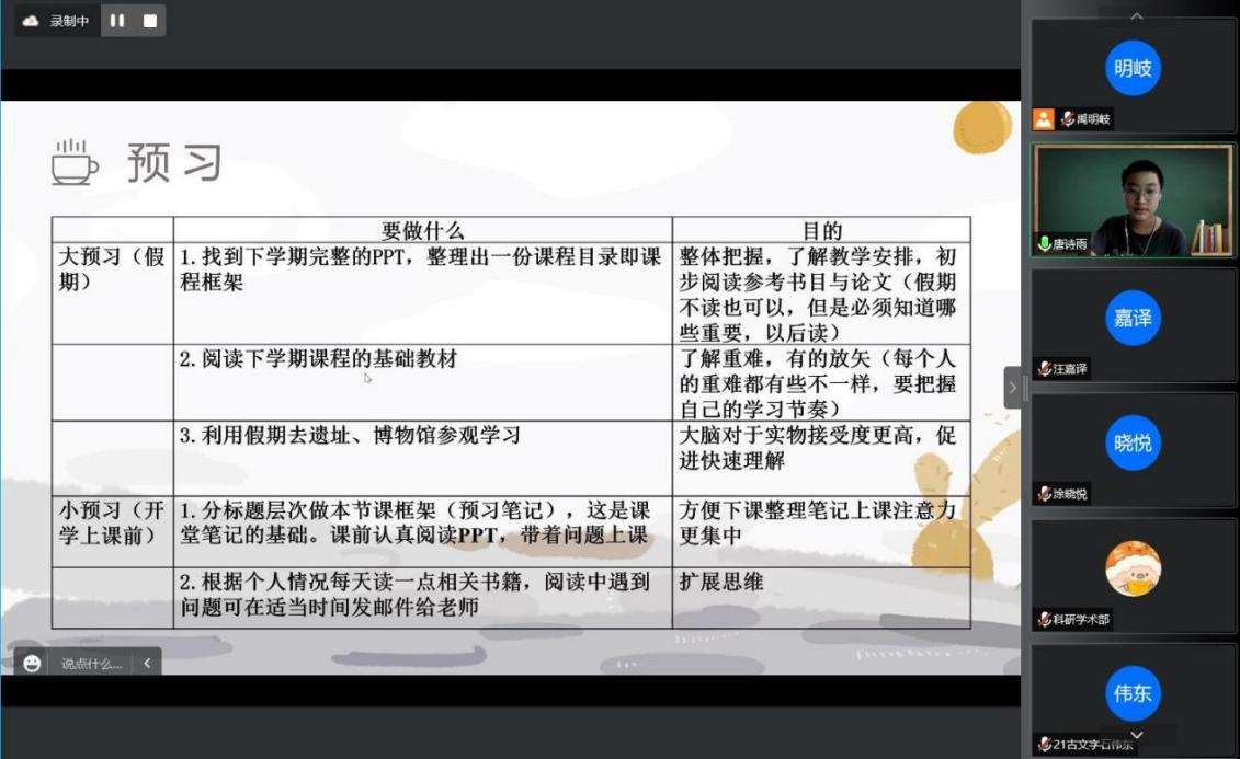 首先,唐诗雨同学从英语分级考试,专业课程,学习方法,课余时间四个方面展开阐述。唐诗雨同学建议新生们要好好复习英语并为新生以后的英语学习提供了建议。同时,唐诗雨同学着重强调了改变学习方法的重要性。鼓励新生打破僵化的思维习惯,培养自学能力。并从个人经验出发向新生推荐了考古方向的公众号,网站等学习资源。