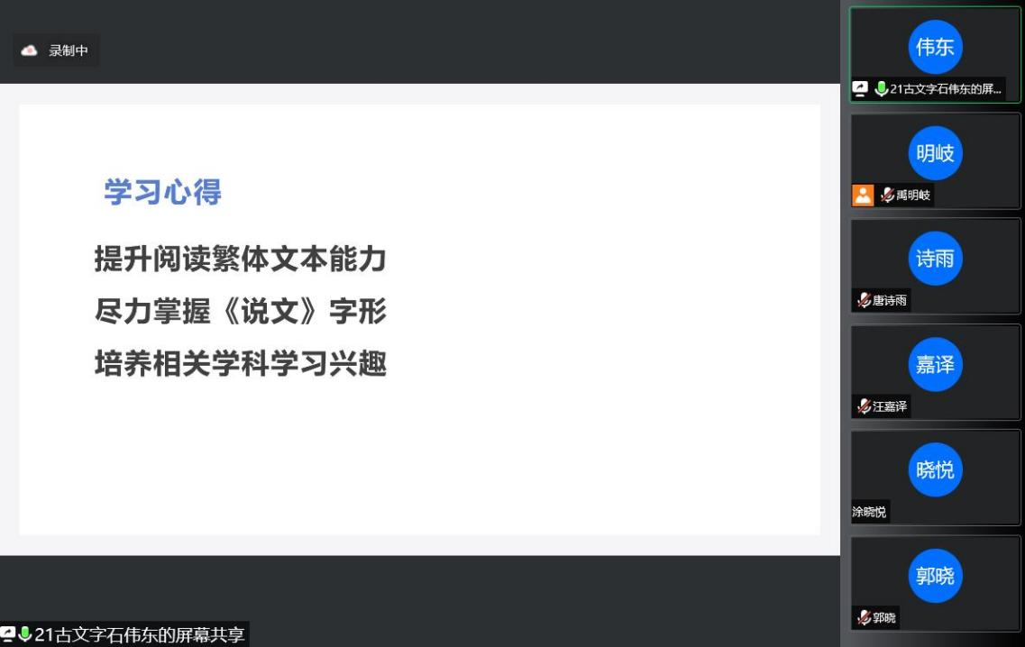 最后,石伟东同学在介绍专业课程的组成后,从提升阅读繁体文本能力,尽力掌握《说文》字形,培养相关学科学习兴趣三个方面分享了自己的学习心得。推荐了《古文字学初阶》、《中国古文字学通论》等专业书籍并进行详细介绍。从石伟东同学细致耐心的讲解中,想必新生们能够感受到古文字学的魅力。