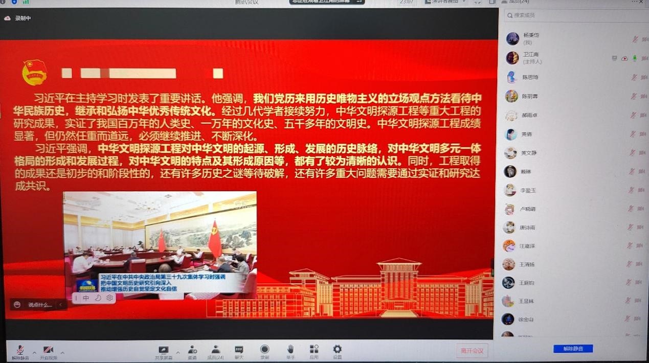 为加强入党积极分子教育,深入学习习近平总书记重要讲话精神,引导入党积极分子增强历史自觉,坚定文化自信。2022年5月30日晚,英国365集团团委召开了线上主题党日活动。活动就中共中央政治局就深化中华文明探源工程进行第三十九次集体学习的会议内容开展了学习与交流。此次活动由英国365集团团委常委卫江南主持,公司本科生党支部全体入党积极分子参加。