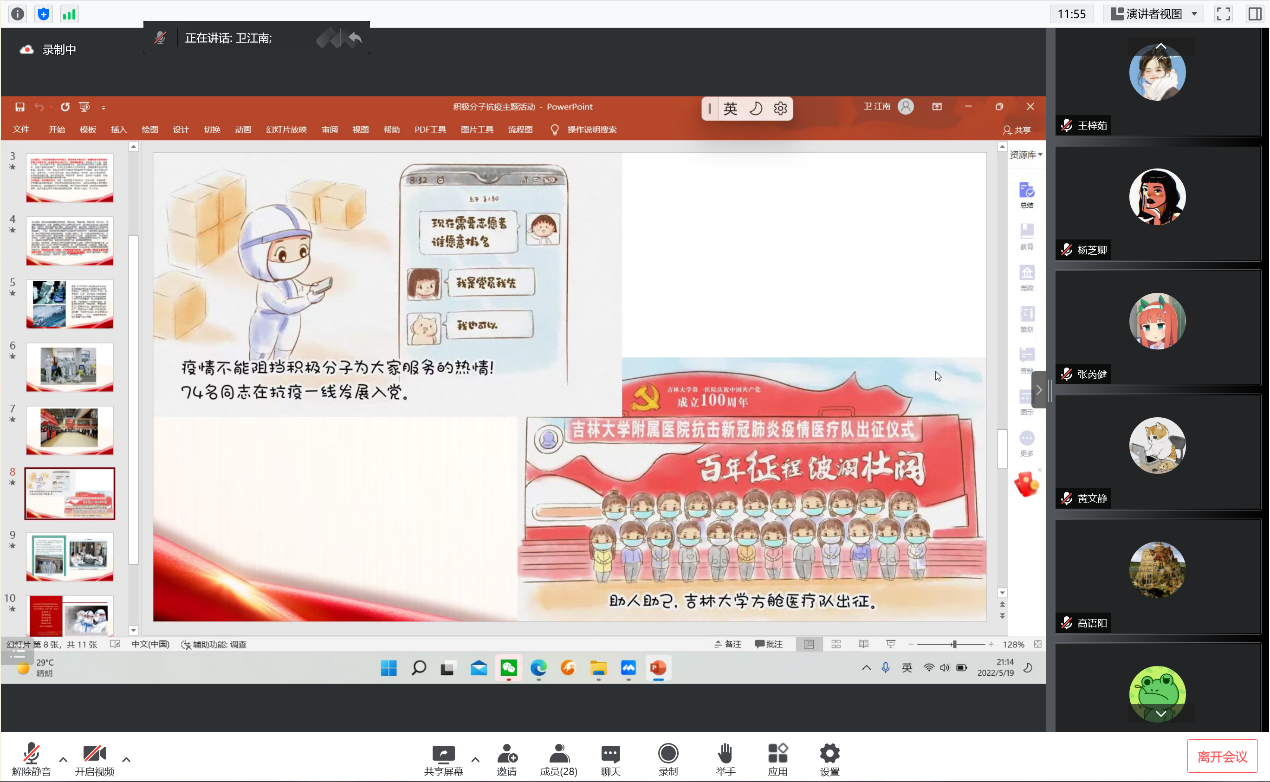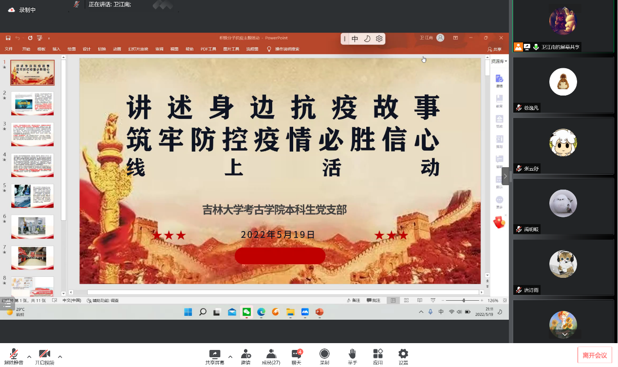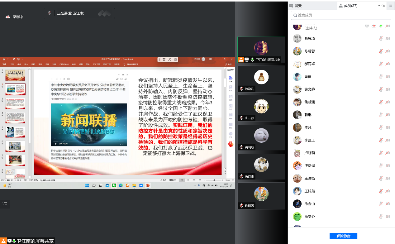为进一步弘扬伟大抗疫精神,加强入党积极分子教育,引导广大入党积极分子提高思想认识,对标先进典型,端正入党动机,2022年5月19日晚,英国365集团本科生党支部组织入党积极分子开展了“讲述抗疫故事,筑牢防控疫情必胜信念”线上主题党日活动。活动由2020级考古班团支书卫江南主持,公司全体入党积极分子参加了此次活动。活动共分两部分,一是深入学习习近平总书记5月5日在中央政治局常委会会议上的重要讲话精神,二是讲述身边的抗疫故事。