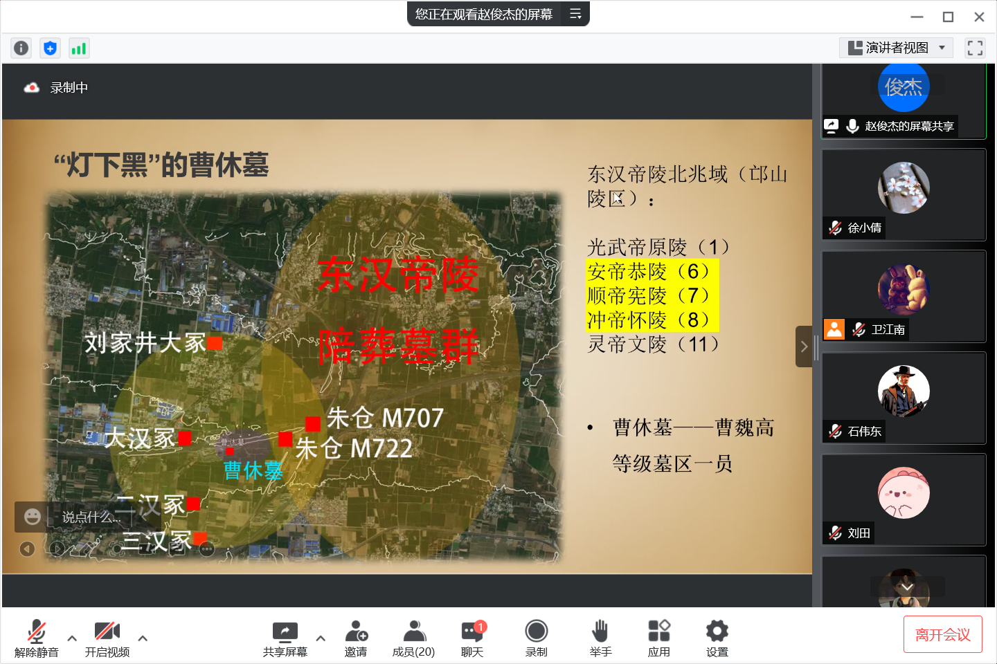 最后,赵俊杰老师以东汉-北魏洛阳城郊帝陵的葬地空间的介绍,结束了本次精彩的“云游”魏晋帝陵之旅。在本次活动中,学术讲解与互动环节交融穿插,同业们纷纷从活动主题中,找到与自己兴趣相契合的内容积极发问。赵俊杰老师亦十分欣赏同学们踊跃互动的求知欲,并称赞道同学们能把新学习到的知识与旧知识融合贯通,同时一一给予详细的答疑解惑。整体课堂氛围不失轻松愉快,师生交流的学术问题也不失深度。