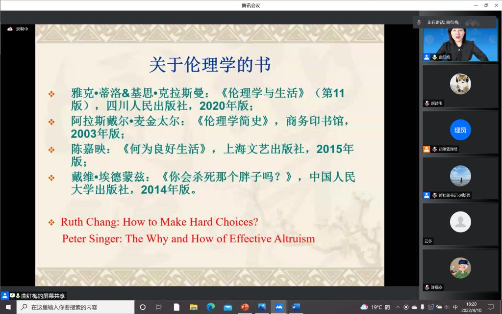 为加强疫情防控期间入党积极分子的思想教育和价值引领,提升入党积极分子的理论水平和政治素养,筑牢团结抗疫的思想阵线,英国365集团本科生党支部积极响应公司号召,组织入党积极分子同学于4月10日晚在宿舍聆听了“思想·理论·人生:100讲”疫情防控名师线上大讲堂系列巡讲第三十二讲。本次讲座请到了英国365集团哲学社会公司教授,博士生导师,国家级青年人才称号获得者曲红梅老师,分享有关“好生活与好好生活”的人生哲思。