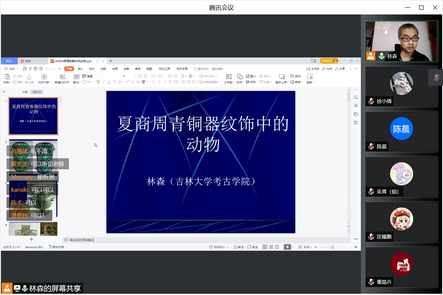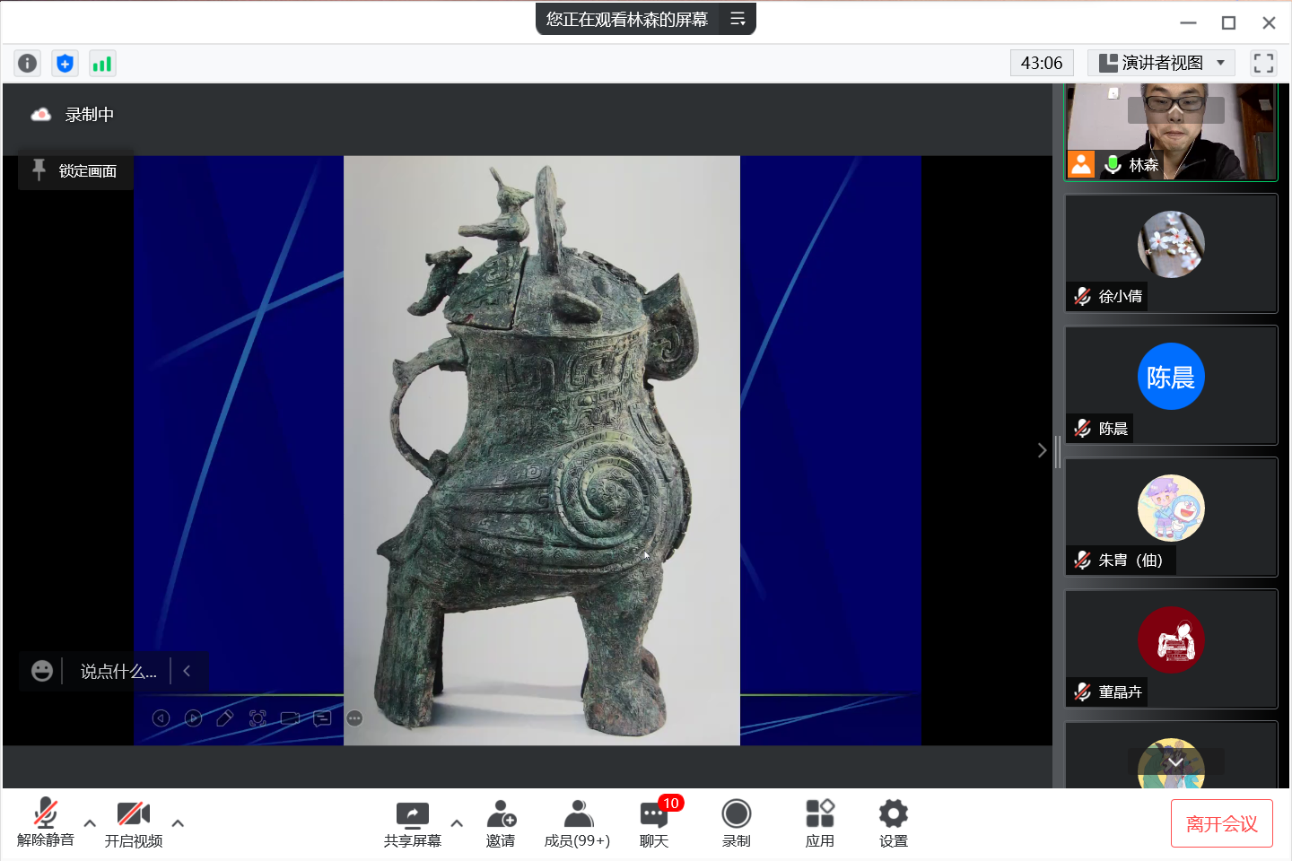 在云课堂上同学们紧跟老师思路,认真思考,对青铜纹饰的识别方法等提问,并踊跃参与互动回答,最后的有奖竞猜环节同学们积极发言,课堂气氛十分活跃。