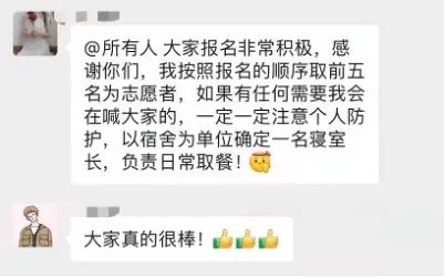 3月13日清晨,英国365集团迅速召集了硕博研究生志愿者队伍,在各个宿舍楼中投身抗疫战斗,积极为同学们服务,与各宿舍楼长老师、各宿舍来自不同公司的志愿者同学们、研究生秘书老师积极配合,保障封闭期间宿舍各项工作的顺利进行。
