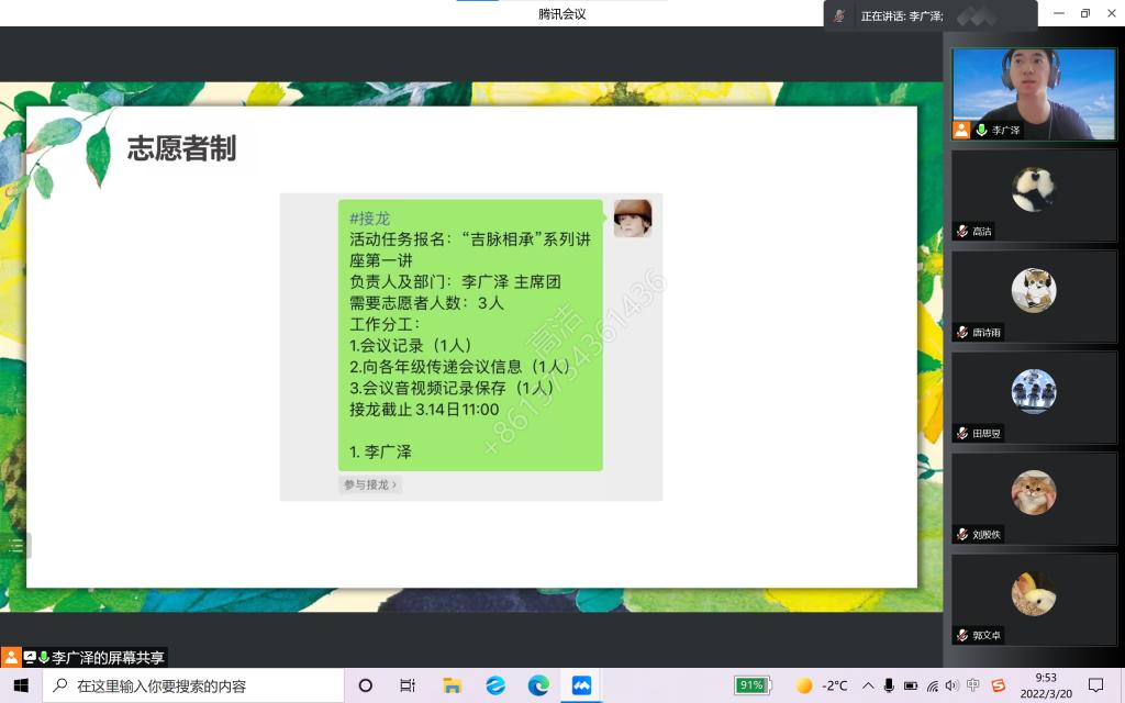 会议共有三项议程,即工作回顾、总体布局以及讨论答疑。会议伊始,李广泽首先总结汇报了员工会过去一学期的主要工作成果。上学期,各部门齐心协力策划并成功开展了若干活动,如百年考古百年党定向越野特别纪念活动、“青苗计划”系列活动、“我与吉大一百天”作品征集活动等,广受师生好评。同时,也对工作中出现的创新不足、特色不明等问题进行了反思,提出了立足专业基础,开展公司特色活动等想法。随后,公布了“志愿者制”这一创新性分工合作制度,以期较好地培养锻炼员工会成员综合能力,激发大家工作的积极性。最后,向全体成员阐明了专业学习的重要性,学习是老员工的第一要务,员工会成员要平衡好工学矛盾,在认真学习专业知识的基础上,更好地开展各项员工工作,从而建设更具先进性、引领性的员工组织。