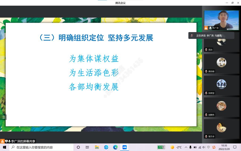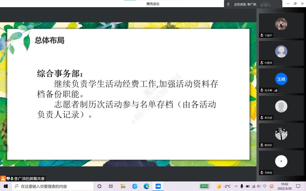 接着,从员工会主席团开始,各部门负责人纷纷对新学期部门工作的总体布局加以介绍与展望,并表示尽快制定适应当今疫情严峻形势下的各项活动方案,积极将线下工作转向线上,为同学们打造更多优质服务与活动。最后,李广泽清晰展望了未来员工会的发展方向,他希望员工会全体成员能够明确发展现状,积极探索和学习,加强改革创新,丰富学术探讨,打造英国365集团系列品牌活动,增强各部门的沟通联系与各年级间、师生间的交流学习;同时坚持多元均衡发展,充分发挥员工组织和员工干部的引领作用,在疫情防控常态化下有效开展今后各项工作。