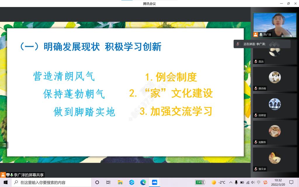 会议最后,马老师对本次会议进行了总结。马老师首先对上学期各部门开展的工作及相关负责人的表现给予充分肯定,并提出了若干建议:各部门间应注意合理分配工作任务,主席团也应加强整体统筹协调,并持续开展员工组织内部的“传帮带”工作;员工干部首先应注重坚持学习,提升个人素质与专业素养,营造先进员工组织的良好学习风气;在疫情防控常态化下,推动各项工作转向线上开展,并提高工作效率和完成质量。马老师同时期望,在今后的工作中,员工会能够明确组织定位,加强成员间的沟通交流,提升成员们的自信心与责任感,从而更好为公司师生办实事。上午10点30分许,本次例会顺利结束。