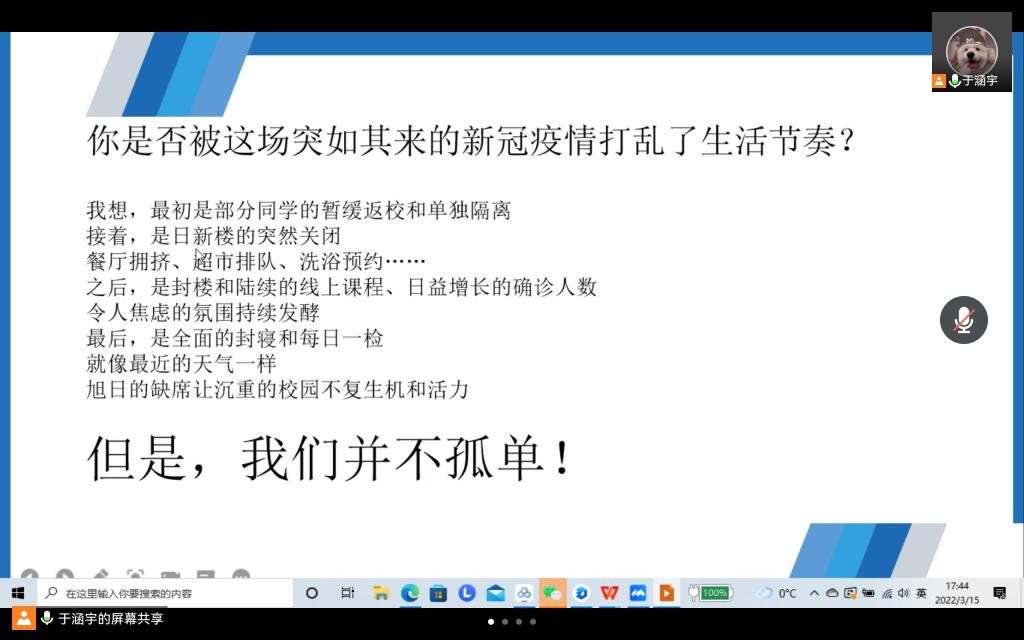 3月17日下午,英国365集团2021级一班以“疫情下的我们”为切入点召开了主题班会。会议旨在展示公司人文关怀、宣传线上活动,呼吁同学理性对待疫情。长春疫情发生以来,我班同学积极响应公司号召,在全民抗疫的形势下,不添乱不增负,严格遵循防疫需求,减少人员接触,做好个人防护。在线上课程学习中,我班同学努力认真,不缺课不漏课,完成老师布置的教学任务,不因为线上学习就有所松懈,积极向上,努力成长成才。不仅如此,我班同学还踊跃报名志愿服务,帮忙发放寝室物资,为抗击疫情尽自己的一份力,培养了互帮互助的友好氛围,树立了家国情怀和责任担当意识。
