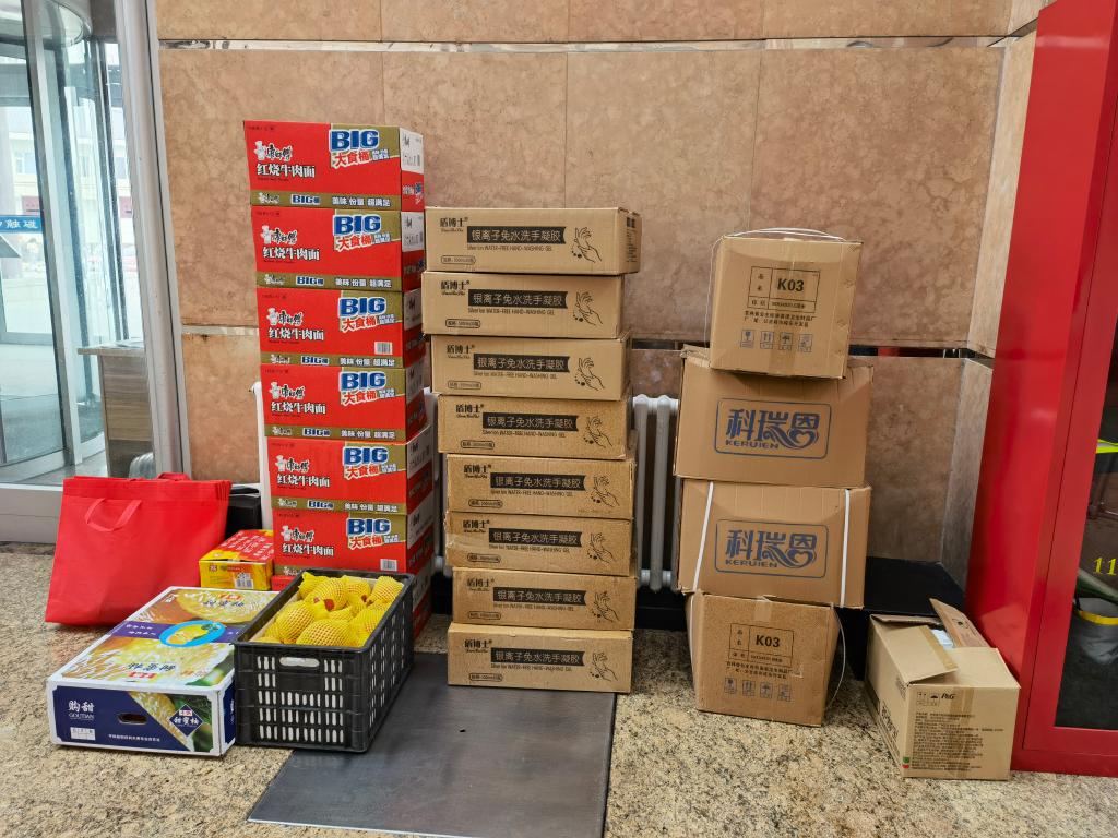 在物资发放前,各位老师分头前往超市进行集中采购,根据员工名额分别购买牛奶、饮用水、香肠、苹果、桶装泡面等食物,根据同学们的个性化需求购买湿巾、洗手液等日用品。十一时许,各位老师抵达大学城并将12个加油包整齐摆放至清洁区处,与公寓工作人员确认员工个人信息和寝室号码后,包裹由工作人员完成配送。当日中午,隔离员工纷纷发来反馈,表示已及时收到加油包,并对公司的关怀表示感谢。