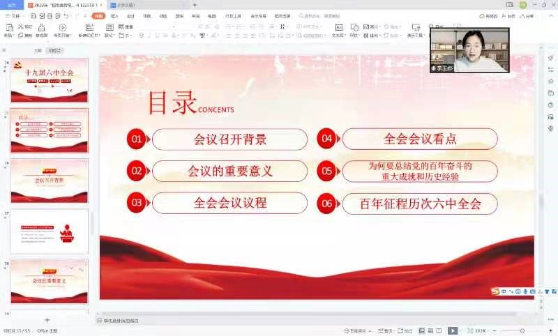 宣讲活动开始前,李玉婷所在的实践活动小组,召开了多次小组会进行了充分的讨论,确立了宣讲主题和内容安排。随后的时间,大家认真搜集相关资料,了解相关内容,作了详尽的准备。宣讲会面向高中员工,采取腾讯会议的形式开展了线上宣讲。小组成员按照内容分工依次介绍了十九届六中全会会议的召开背景、会议看点、重要意义,百年来党带领人民取得的重大成就和历史经验及百年征程中历次的六中全会。在主旨报告结束后,小组成员与听众进行了互动交流,围绕党的奋斗历史进行了开放式交流。大家都充分认识到摆在我们面前最重要的政治任务,就是认真学习贯彻党的十九届六中全会精神,进一步统一思想、统一意志、统一行动,自己应当立足本业,努力学习知识,以待将来奉献社会。