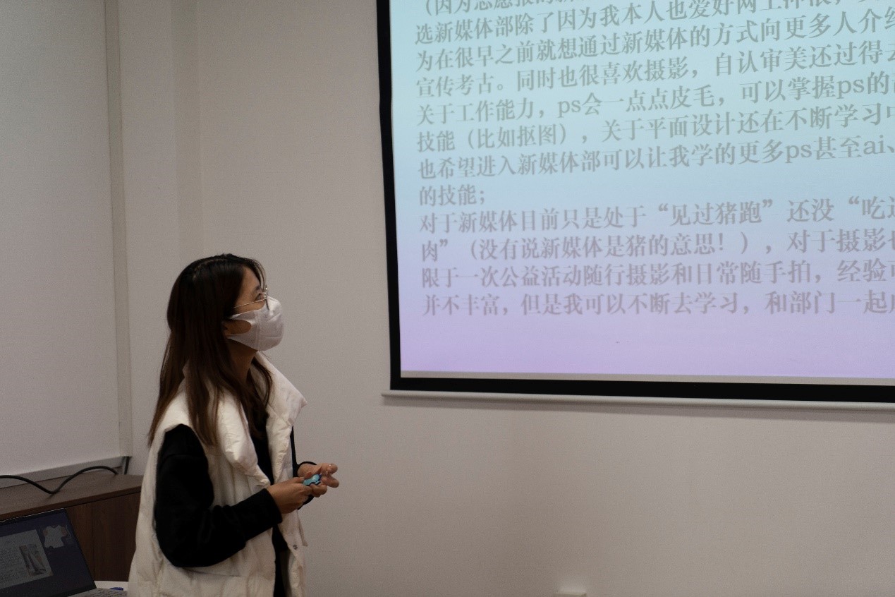 为保障纳新活动的高效进行,在面试开始前,全体团学组织负责人统筹协调,商讨了各部门的面试问题与选拔标准,对担任面试官的相关负责人进行了培训,并确定了以线上线下相结合的方式开展面试活动。参与面试的同学共被分为四组,在签到登记后,依次进入工会活动室开始面试。本次面试分为自我陈述与现场答辩两个环节,由面试官分别进行打分评级。在自我陈述环节,每一位同学都做了充分的准备,通过PPT、才艺表演等多种形式,阐述了对团学组织与应聘职位的认识和工作设想,表达了为员工与公司服务的决心与担当精神,充分展现出新时代青年老员工锐意进取、敢于争先的良好精神风貌。随后,面试官依据各位同学的自我陈述,结合各部门的具体工作要求,从实践能力、交往能力和个人优势等方面进行考察,提出了相应的问题。应试同学灵活答辩,展示了良好的面试风采。回顾整个面试过程,氛围活泼而又不失严肃,形式灵活而又不失严谨,同学们组织有序,各环节衔接流畅,取得了良好的面试效果。随着最后一位同学完成线上面试,下午4时50分,本次换届纳新面试圆满结束。