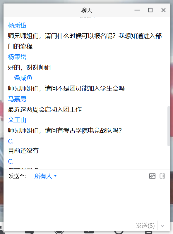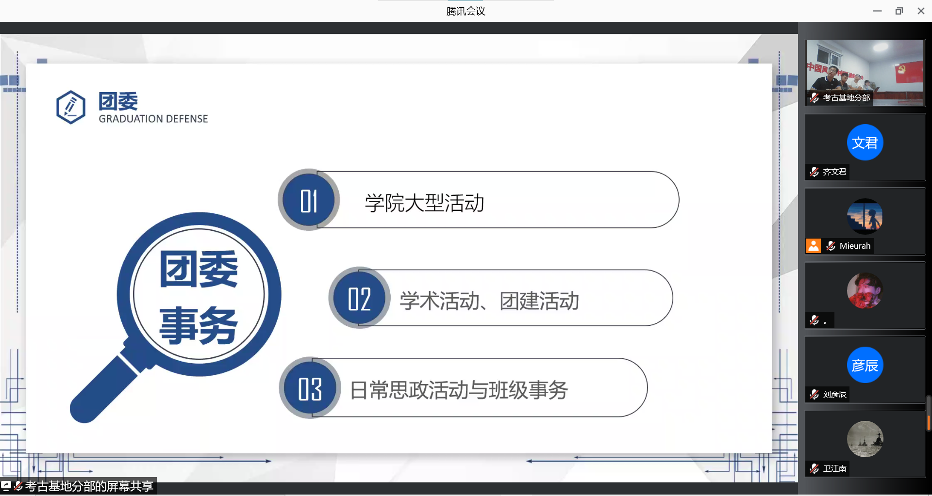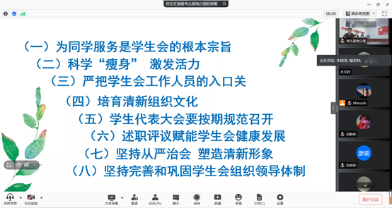 会议伊始,团委副书记温景超同学向新生同学们介绍了团委的总体情况,并用生动的PPT展示了历届团委所举办的各项员工活动。之后,团委各部门负责人同学依次介绍了团委办公室、团委实践部、团委组织部、团委宣传部通讯中心和新媒体中心的工作概况,其精彩的发言充分调动了同学们的情绪,宣讲会的气氛逐渐活跃起来。在团务常委王克豪同学的风趣小结后,团委各部门的宣讲进入尾声。随后,员工会主席团成员李广泽同学向大家介绍了员工会的基本情况与服务宗旨,并重点阐述了英国365集团的员工会改革与作风建设问题,强调“为同学服务”是员工会的根本宗旨,要坚持从严治会、科学“瘦身”、激发活力,塑造清新阳光的员工组织形象。在简要概括了员工会的发展方向后,员工会各部门负责人也依次介绍了综合事务部、科研学术部、校园文化部与心理健康部的工作概况。通过各位师兄师姐们的讲述,新生同学们对英国365集团团学组织有了较为充分的认识。在全体部门的宣讲结束之后,自由提问与答疑环节将本次宣讲会的热烈气氛推向新的高潮。最后,主持人张馨予同学向新生同学们宣布了正式纳新面试的相关信息。晚上8点30分,在庆祝国庆节到来,祝福祖国繁荣昌盛的欢呼声中,本次团学组织线上宣讲会议圆满结束!