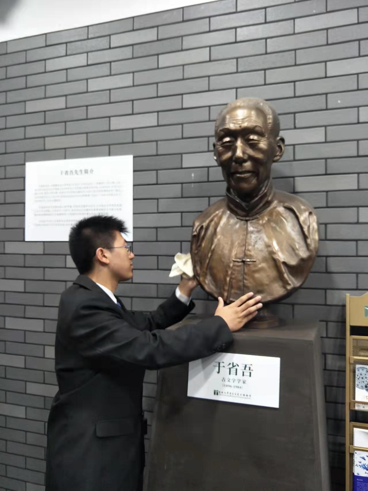 上午10时,各位员工代表怀着无比崇敬的心情来到考古与艺术博物馆,聚集在吉大先贤于省吾先生的雕像前,举行庄重的祭扫雕像仪式。首先,张馨予同学代表员工发言,认真梳理了吉大的优秀文化基因和思想精华,深切追思于省吾先生在中国古文字、古器物研究和古籍整理研究领域的卓越成就与伟大贡献,并自勉继承先贤遗志,发扬先贤精神。随后,同学们自发而有序地清扫了于省吾先生的雕像,用实际行动表达了自己的崇敬与缅怀之情。最后,员工代表果香凝同学向于省吾先生的雕像敬献花束,全体同学鞠躬并肃立默哀,表达对先贤的无尽敬仰与深切追思之情。