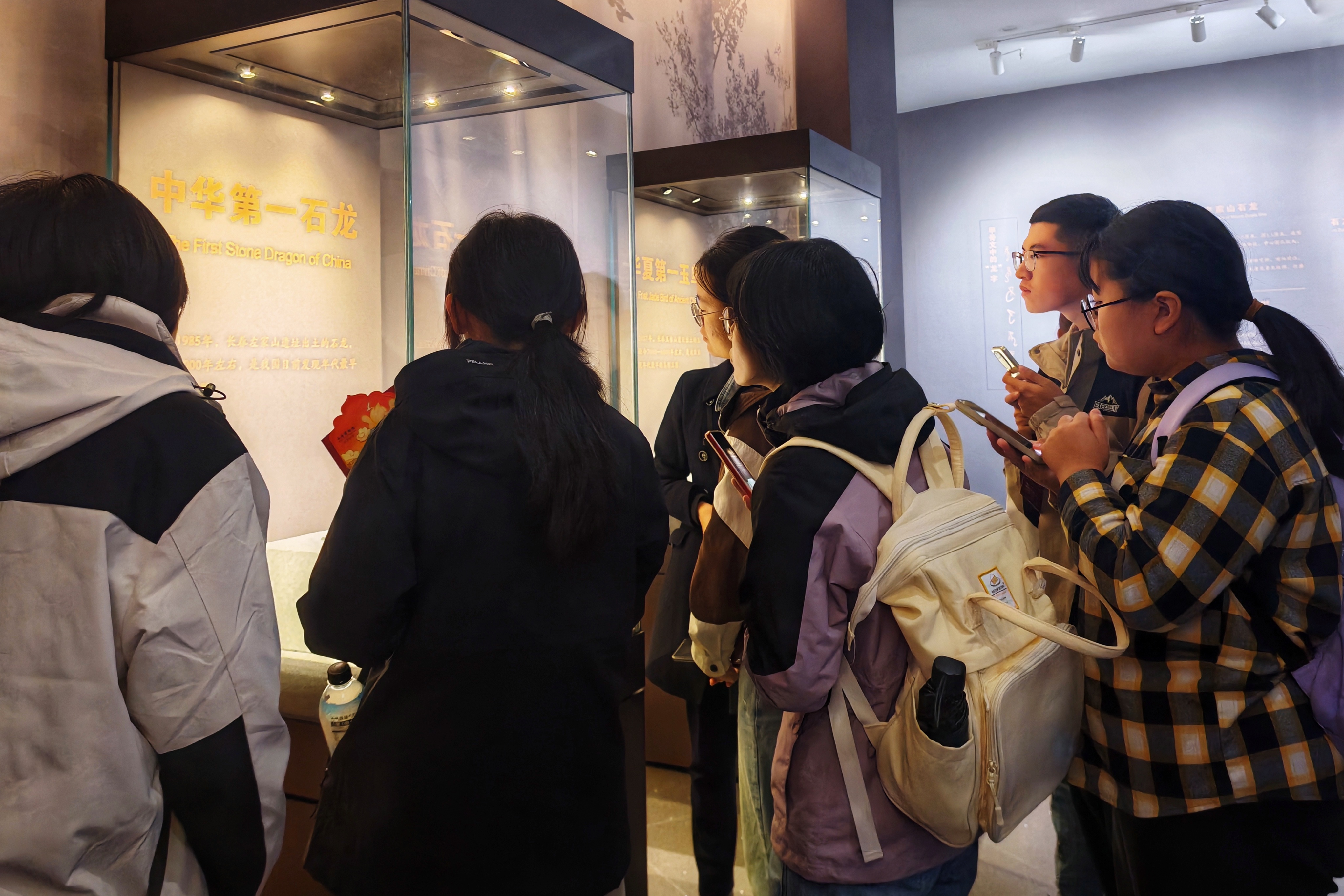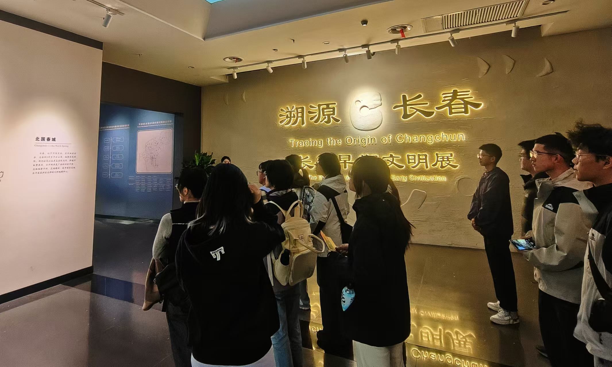 在侯芊里同学的带队下,同学们进入长春博物馆参观学习。映入眼帘,“溯源长春”四个大字总瞰了场馆的主题。从旧石器时代到现代,同学们跟着讲解员、循着场馆动线逐步走入长春这座北国春城的历史,穿过数百万年的纱幕,得以一窥春城的古今风物。其中,“长春第一人”复原像、“中华第一石龙”等藏品使同学们驻足尤久,不仅富于北方地域代表性,更富于中华文化的魅力。