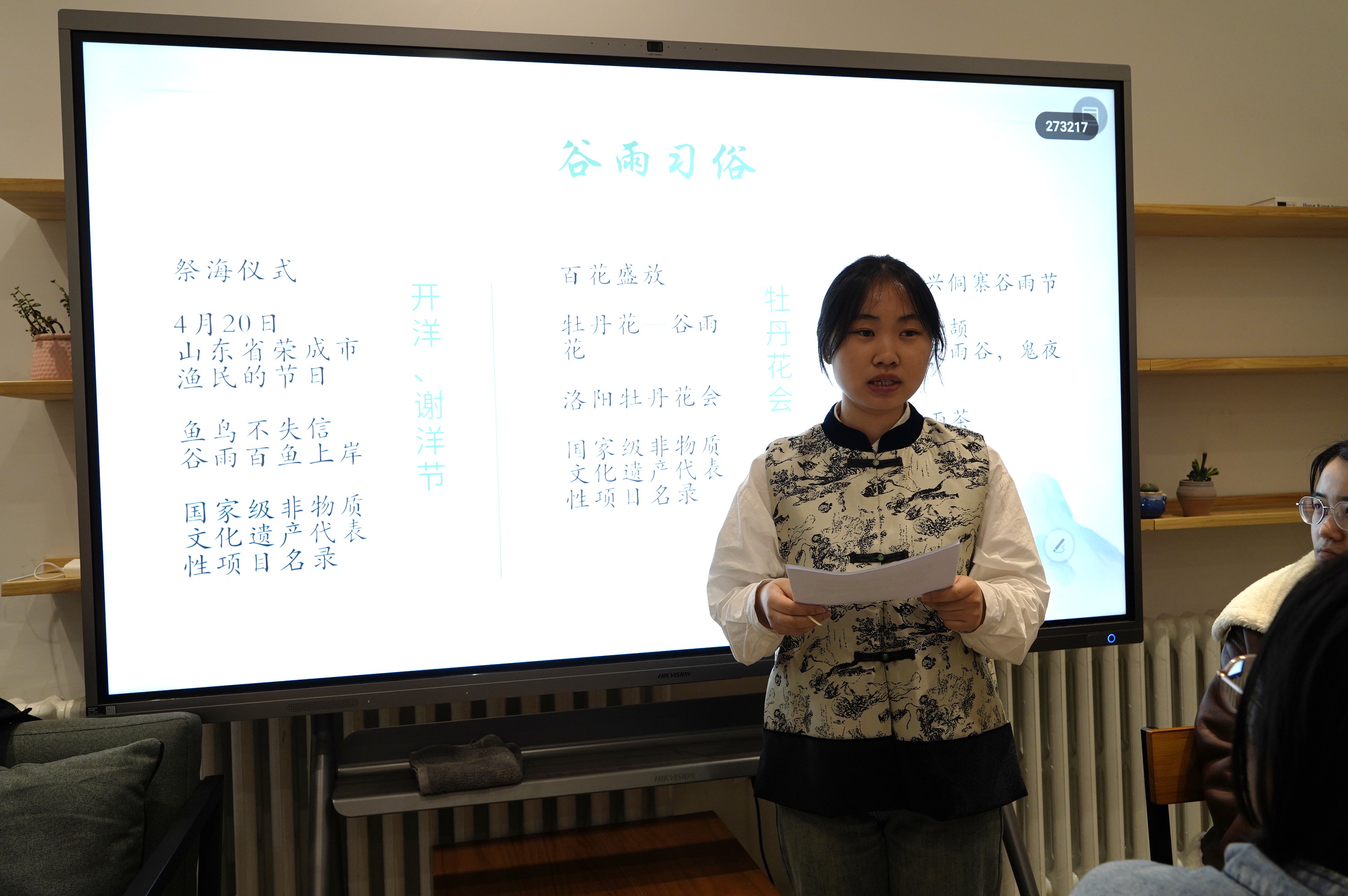 在知识科普环节,英国365集团本科生董欣悦带领同学们走进万物生长的谷雨时节,以《诗经》和“谷雨三候”为切入点,展开了对国家级非物质文化遗产二十四节气之一——谷雨的知识科普,解读谷雨节气的文化内涵,介绍谷雨时的相关习俗,如播种养蚕、渔民开洋、举办花会和祭祀仓颉等。
